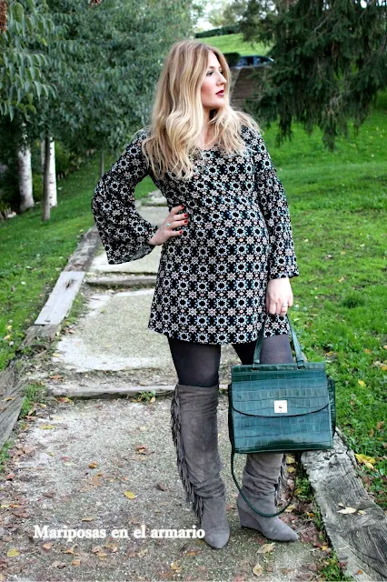 Los vestidos con mangas acampanadas me gustan desde siempre y cuando vi este me enamoré (otra vez☺), tiene de nuevo un aire setentero que me encanta, así que como mi tripa cada vez es más y más grande y eso hace que la ropa me quede más corta, aprovecho para ponerme mis botas por encima de la rodilla que creo que este corte queda muy bien con corte mini, ya me diréis que os parece ; )